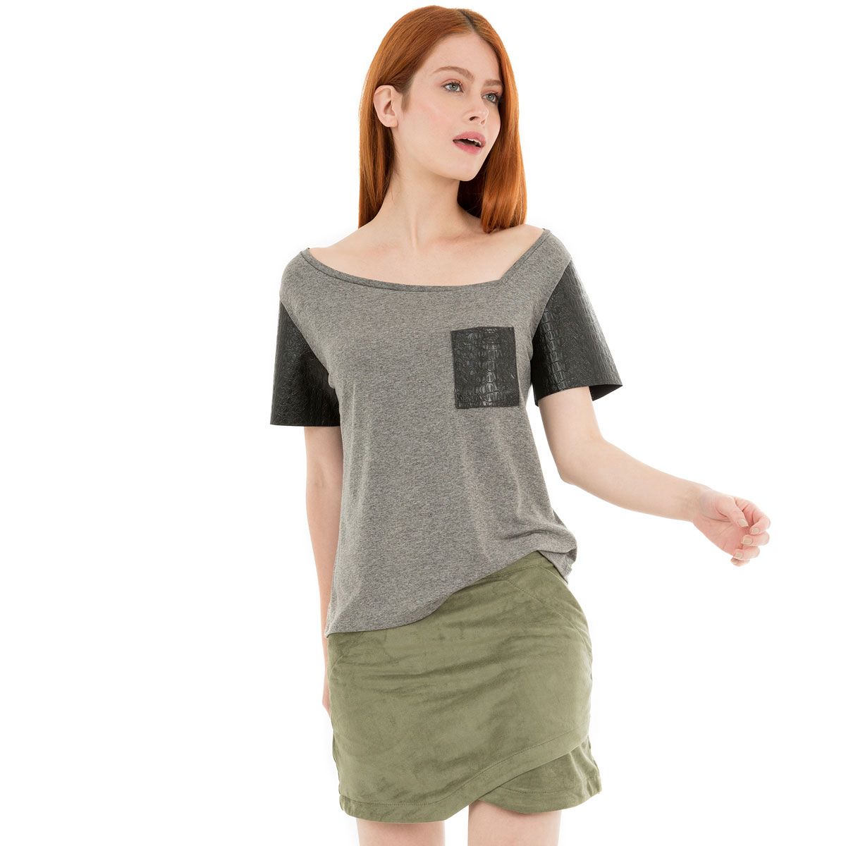 •• Camiseta gola assimétrica, em malha de gramatura fina, levemente transparente, bolso e manga em couro croco sintético. Modelagem solta.